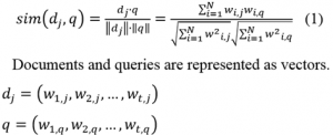 - Vector space model, Gerard Salton dan rekan-rekannya menyarankan sebuah model berdasarkan kriteria Luhn’s similarity yang memiliki motivasi teoritis yang lebih kuat (Salton dan McGill 1983). Dalam Vector Space Model (VSM), dokumen dan kueri diwakili sebagai Vektor dan sudut antara keduanya. Vektor dihitung dengan menggunakan fungsi kosinus kesamaan. Kesamaan Fungsi kosinus dapat didefinisikan sebagai: