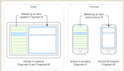 Contoh bagaimana dua modul UI yang didefinisikan oleh fragmen bisa digabungkan ke dalam satu aktivitas untuk desain tablet, namun dipisahkan untuk desain handset.