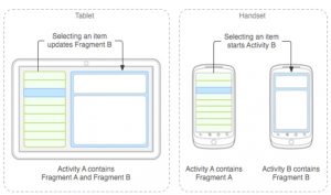 Pada aplikasi berita dapat menggunakan satu fragmen untuk menampilkan daftar artikel di sebelah kiri dan fragmen lainnya untuk menampilkan artikel di sebelah kanan—kedua fragmen ini muncul di satu aktivitas, berdampingan, dan masing-masing fragmen memiliki serangkaian metode callback daur hidup dan menangani kejadian masukan penggunanya sendiri. Sehingga, sebagai ganti menggunakan satu aktivitas untuk memilih artikel dan aktivitas lainnya untuk membaca artikel, pengguna bisa memilih artikel dan membaca semuanya dalam aktivitas yang sama, sebagaimana diilustrasikan dalam layout tablet pada gambar di bawah ini.