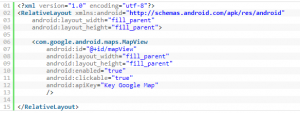 Disini untuk menampilkan MAPnya kita menggunakan tag com.google.android.maps.MapView,