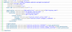 - Untuk dapat melakukan menampilan Map Google Map dan Menangkap GPS dari satelit kita perlu menambahkan <uses-library>com.google.android.maps dan <uses-permission> INTERNET, ACCESS_FINE_LOCATION, ACCESS_COARSE_LOCATION nya melalui file AndroidManifest.xml buka file AndroidManifest.xml lalu ketikkan seperti kode berikut :