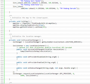 Perhatikan method initLokasi(), pada method ini kita mendaftarkan data lokasi dari rumah makan padang.