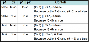 Operator OR (||) bernilai true jika salah satu kondisi operand-nya true, Jika kedua operand-nya false, maka OR akan bernilai false