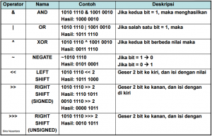 Shorthand pada bitwise: (&=, |=, ^=, <<=, >>=, >>>=), Bitwise hanya dapat dilakukan pada tipe data bilangan bulat: byte, short, int, dan long, Bitwise pada tipe data char akan dikonversi ke int (mengacu ke nilai ASCII)
