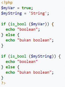 Boolean adalah suatu tipe data yang hanya mempunyai dua nilai. Yaitu true atau false (benar atau salah).Pada beberapa bahasa pemograman nilai true bisa digantikan 1 dan nilai false digantikan 0.