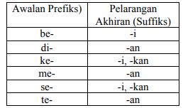 - Imbuhan yang sama tidak pernah diulangi, sebagai contoh, setelah Awalan “te-“ atau dengan variasinya. Maka tidak akan mungkin Awalan “te-“ tersebut akan diulang kembali