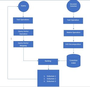 Pada Gambar diatas kita dapat melihat alur proses dari metode latent semantic indexing dibagi 2 (dua) kolom, yaitu kolom sebelah kiri yaitu query dan kolom sebelah kanan yaitu koleksi dokumen. Pada proses sebelah kiri, query diproses melalui operasi teks, kemudian vektor query dibentuk. Vektor query yang dibentuk dipetakan menjadi vektor query terpeta (mapped query vector). Dalam membentuk query terpeta, diperlukan hasil dekomposisi nilai singular dari koleksi dokumen. Pada koleksi dokumen dilakukan operasi teks, kemudian matriks kata-dokumen (terms-documents matrix) dibentuk, selanjutnya dilakukan dekomposisi nilai singular (singular value decomposition) pada matriks kata-dokumen. Hasil dekomposisi disimpan dalam collection index. Proses ranking dilakukan dengan menghitung relevansi antara vektor query terpeta dan collection index. Selanjutnya, hasil perhitungan relevansi ditampilkan ke pengguna (Bunyamin, 2005).