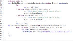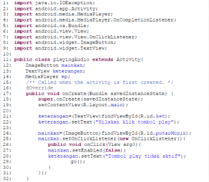 Kita akan membuat aplikasi sederhana untuk memutar file .mp3 melalui sebuah tombol play. Skenarionya, jika tombol play diklik, mp3 akan dimainkan. Pada saat bersamaan tombol play menjadi disable . Namun jika mp3 selesai berputar, baru kemudian tombol play enable kembali.
