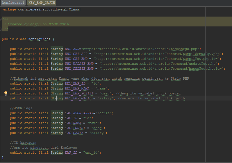 8. selanjutnya membuat Java Class baru di dalam package yang ada dengan nama konfigurasi. fungsi dari class ini adalah untuk membaca WebService yang sebelumnya kita buat. dan selanjutnya adalah akan di implementasikan menjadi aplikasi android yang kita buat.